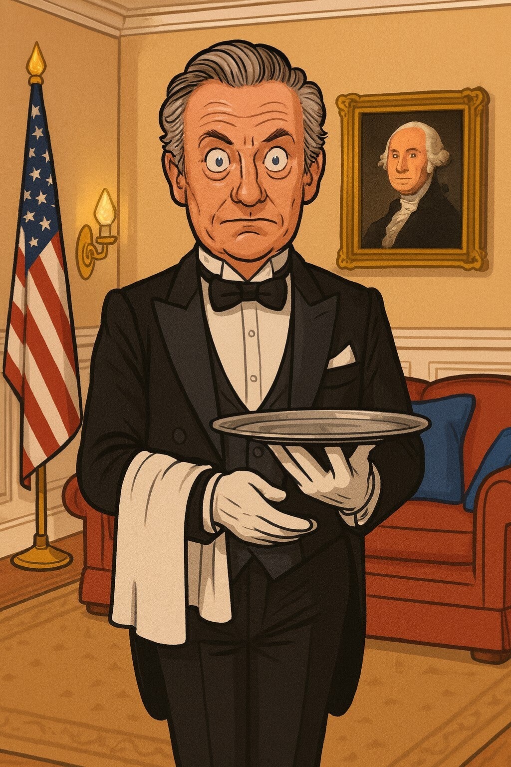 Ein Butler mit loriothaftem Auftreten versucht, die Fassung zu bewahren, während die Situation durch Superkleber und das Verkleiden von Personen eskaliert.